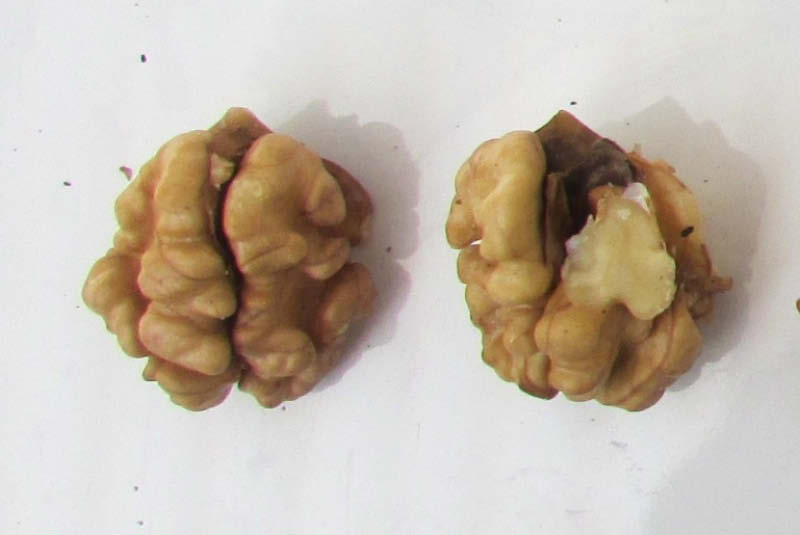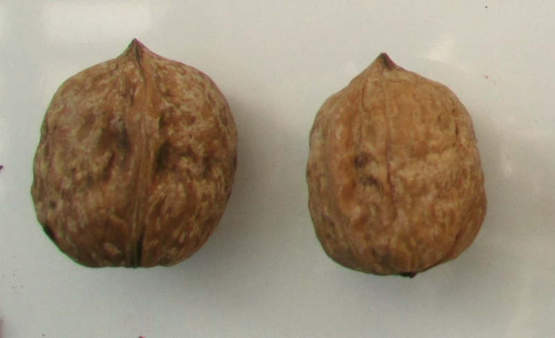 Nuez Es de tamaño medio con una prominencia media del extremo superior. Su forma en sección longitudinal al nivel de la sutura es trapezoidal, su forma en sección longitudinal perpendicular a la sutura es circular. En sección transversal es de forma circular elíptica, en la base perpendicular a la sutura es de forma redondeada a truncada y en el ápice, perpendicular a la sutura es de forma redondeada. El almohadillado de la sutura se ubica en los dos tercios superiores, es de prominencia media, ancho medio y a lo largo tiene poca  profundidad del surco. La cáscara es delgada y presenta una estructura de la superficie moderadamente acanalada, con una fuerte  adherencia de sus dos mitades y membranas divisorias primarias y secundarias de grosor medio